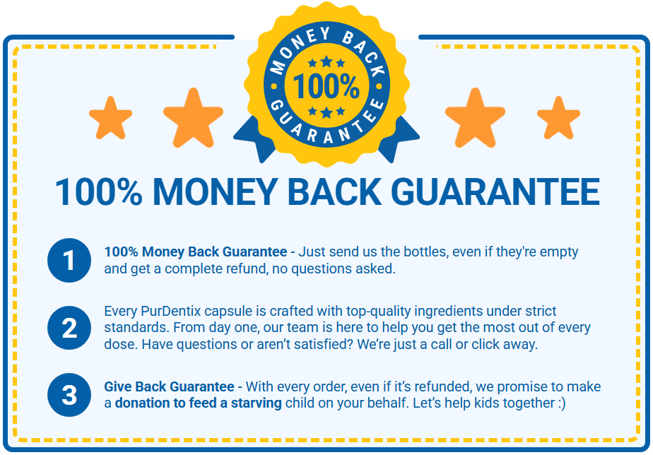 Every single bottle of PurDentix comes with our personal, 60-day, 100% money-back guarantee! If for any reason you’re unsatisfied with your results, just return all the bottles (even if empty) for a full, no questions asked refund.